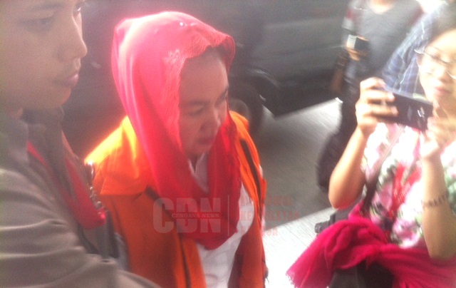 | Bupati Klaten Sri Hartini (berkerudung) saat meninggalkan Gedung KPK Jakarta |