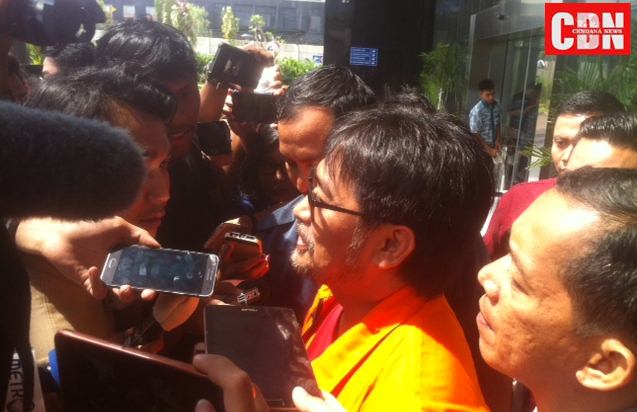 | Choel Mallarangeng (berkacamata) saat keluar dari Gedung KPK Jakarta. |