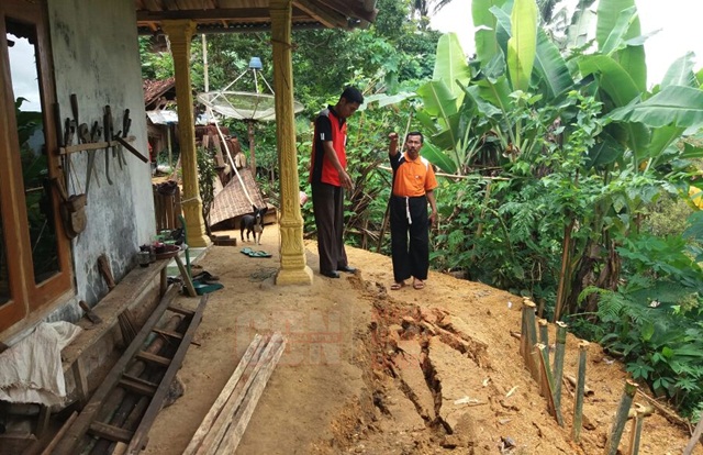 | Kondisi rumah Pardi terancam ambruk akibat longsor. |