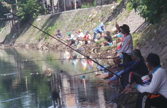 | Warga nampak asik memancing di pinggiran sungai Jangkuk Kota Mataram |