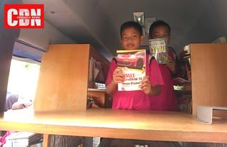 | Siswa SD antusias dengan buku perpustakaan keliling. |