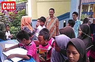 | Suasana bahagia para siswa menyambut mobil perpustakaan keliling. |
