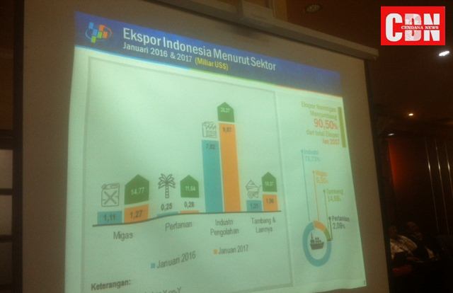 Menurut data BPS Pusat, nilai ekspor Indonesia sepaniang Januari 2017 dibandingkan bulan sebelumnya atau Desember 2016 mengalami penurunan sebesar 3,21 persen, yaitu dari 13.828,7 juta menjadi 13,384, 8 juta. Sedangkan apabila dibandingkan dengan nilai ekspor Indonesia secara Year on Year (YoY) Januari 2017 terhadap Januari 2016 mengalami pertumbuhan sebesar 27,71 persen.