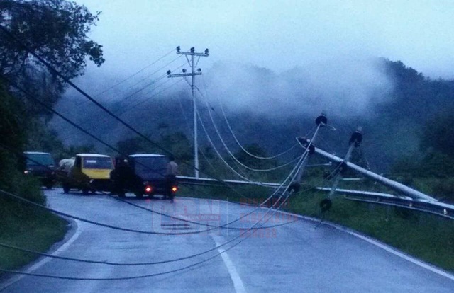 | Hujan juga menyebabkan tiang listrik roboh dan menghambat arus lalu lintas |