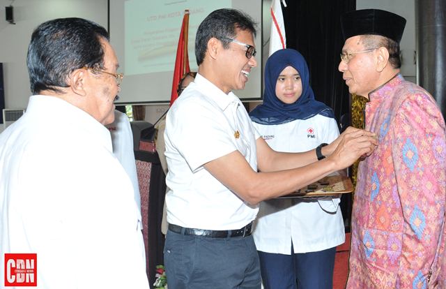 | Gubernur Sumbar, Irwan Prayitno, menyematkan penghargaan terhadap pendonor di Padang. |