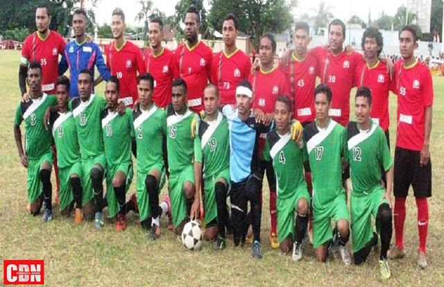 | Kesebelasan Persami Maumere berkostum hijau hijau berpose bersama Persami Jakarta yang berkostum merah hitam sebelum pertandingan berlangsung. |