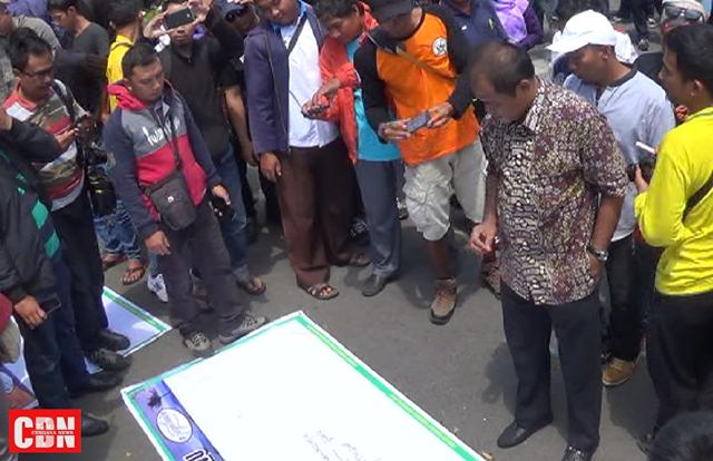 | Bupati Karanganyar, Juliatmono, di tengah massa yang tolak proyek Geothermal Kementerian ESDM. |