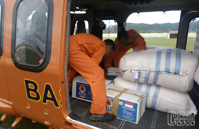 | Petugas Basarnas menyusun barang logistik di dalam helikopter |