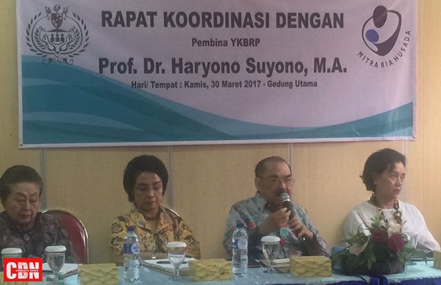 JAKARTA — Prof. Dr. Haryono Suyono, MA., memimpin Rakor Pembina Yayasan Karya Bhakti Ria Pembangunan dan STIKes Mitra Ria Husada di kawasan Cibubur, Jakarta Timur, Kamis (30/3/2017). Turut hadir ibu-ibu istri menteri kabinet pembangunan, pimpinan, dan dosen STIKes.
