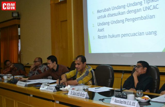 | Sejumlah pembicara dalam Seminar Menangkap Aspirasi Publik Mengenai Rencana Revisi UU No 30 tahun 2012 tentang Komisi Pemberantasan Tindak Pidana Korupsi di Fakultas Hukum UGM. |
