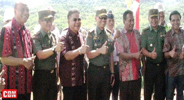 | Dr. Andreas Hugo Parera, MA (ketiga kiri) bersama Danrem 161 Wira Sakti Brigjen TNI Teguh Muji Angkasa,SE.MM (keempat kiri) saat meninjau pembangunan waduk Napung Gete. |