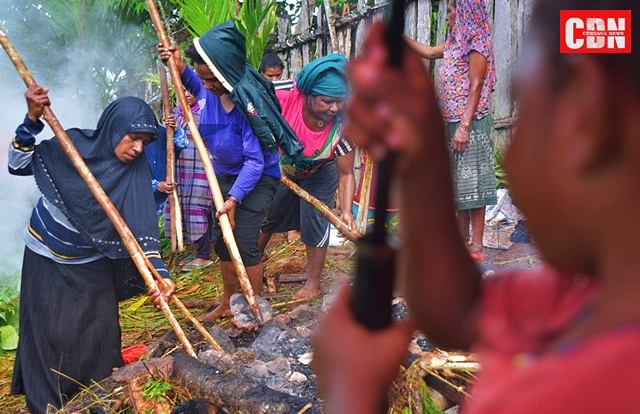 | Perempuan Papua saat beraktivitas membakar batu. |