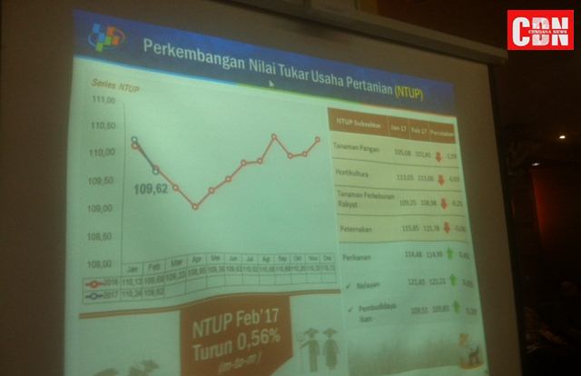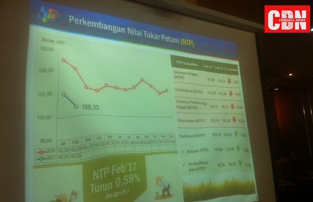 JAKARTA — Badan Pusat Statistik (BPS) Pusat kembali merilis perkembangan terbaru terkait dengan Nilai Tukar Petani (NTP) sepanjang bulan Februari 2017 yaitu sebesar 100,33 persen atau mengalami penurunan sebesar 0,58 persen apabila dibandingkan dengan NTP pada bulan sebelumnya atau Januari 2017.