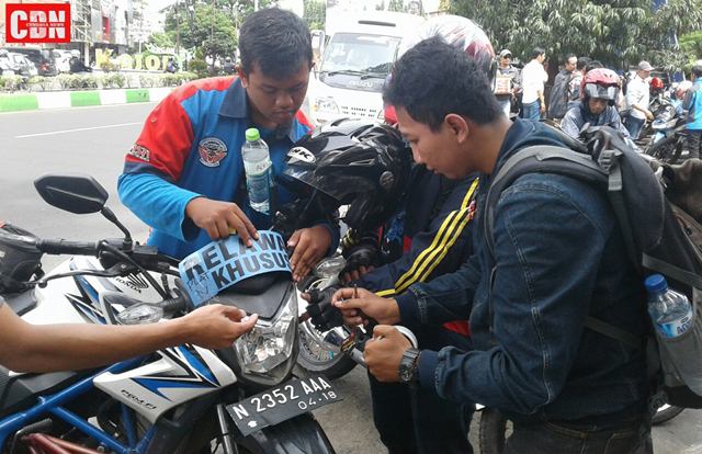 | Para relawan memberi label motornya dengan tulisan Relawan Khusus. |