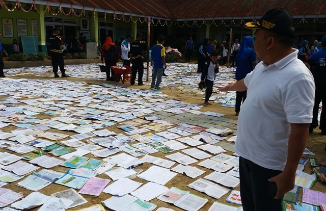| Kondisi arsip dan buku yang dijemur di halaman sekolah pasca dilanda bencana |