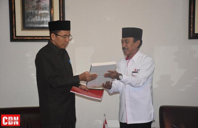 | Ketua PMI NTB, Ridwan Hidayat (kanan), menyerahkan cinderamata kepada Gubernur NTB. |
