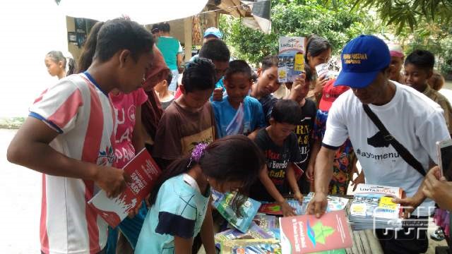 | Anak-anak korban banjir berebut buku bacaan gratis dari Perahu Pustaka |