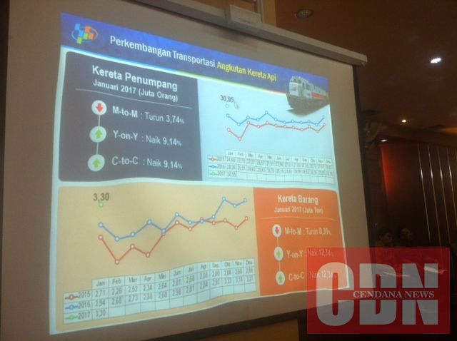 Jumlah penumpang angkutan Kereta Api (KA) yang berangkat sepanjang Januari 2017 sebanyak 30,9 juta orang atau cenderung mengalami penurunan sebesar 3,74 persen apabila dibandingkan dengan bulan Desember 2016. Serupa dengan jumlah penumpang, jumlah barang yang diangkut dengan Kereta Api (KA) mengalami juga mengalami pemurunan sebesar 0,30 persen atau menjadi 3,3 juta ton.