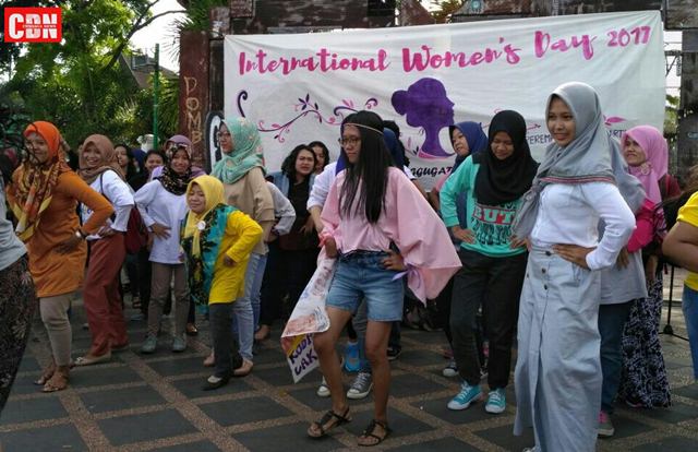 YOGYAKARTA — Sejumlah kaum perempuan dari berbagai kalangan usia memperingati Hari Perempuan Sedunia yang jatuh hari ini dengan berjoget bersama, bertempat di kawasan Titik Nol Kilometer Yogyakarta, Rabu (08/03/2017). Tanpa canggung mereka tampak begitu menikmati berjoget bersama mengikuti alunan musik yang dibunyikan lewat speaker yang mereka bawa. Sejumlah pengunjung pun antusias melihat aksi simpatik di pusat Kota Yogyakarta tersebut.
