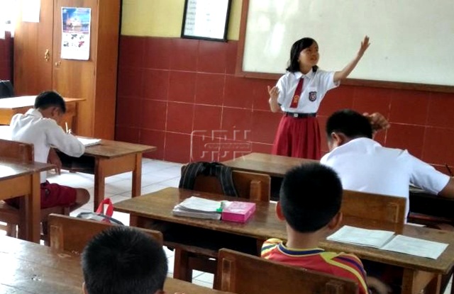 | Salwa Shaqilla saat membawakan puisinya di hadapan teman-teman sekelasnya. |