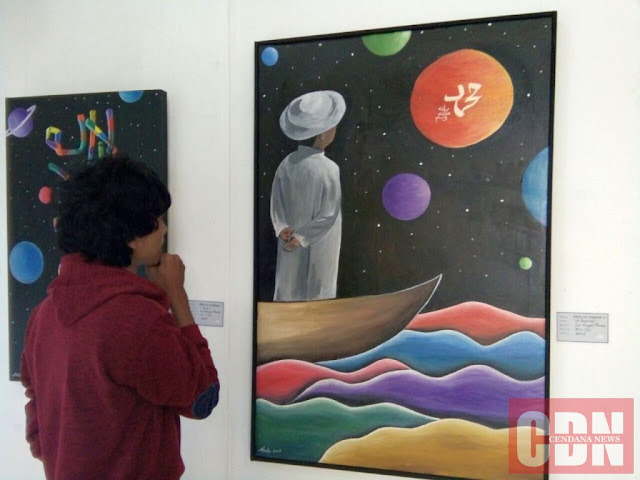 | seorang pengunjung melihat seni lukis karya Abdillah Mubarak yang berjudul: “Ya Rasulullah”. |
