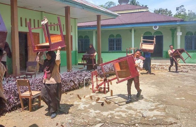 | Sejumlah pelajar sibuk membersikan sekolah pascabencana |