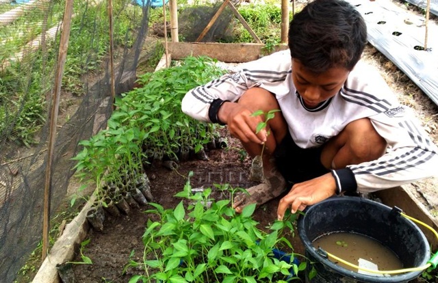 | Salah-satu anak Tukijo membantu menyemai bibit cabai |