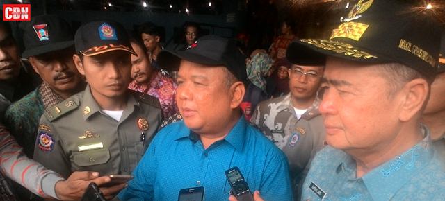 | Staf Ahli Bidang Iklim Usaha dan Hubungan Antar Lembaga Kemendag, Suhanto (tengah) didampingi oleh Wakil Gubernur Sumbar, Nasrul Abit (kanan). |