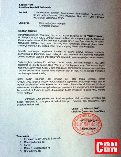 Tembusan dalam surat tersebut yakni Kedutaan Besar China di Indonesia, Menkopolhukam, Kapolri, Menteri Perdagangan RI dan Ombudsman RI. Sabar Olif Iwanggin selaku Kepala Perwakilan Ombudsman Republik Indonesia Provinsi Papua saat dikonfirmasi membenarkan adanya surat masuk terkait kasus tersebut.
