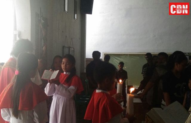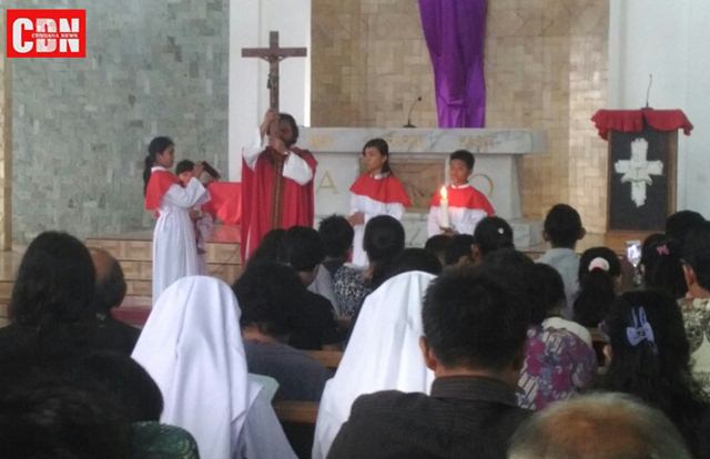| Umat Katolik mengikuti prosesi penghormatan salib. |