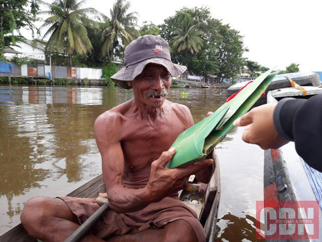 Mereka mendekati klotok yang ditumpangi para awak media untuk menerima bingkisan. Dari atas perahu klotok, wartawan menyodorkan bingkisan ke pemilik rumah yang menjorok ke tengah sungai.