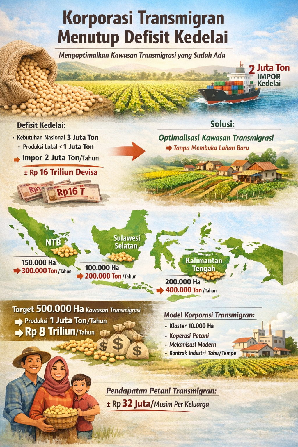 Kedelai bukan semata soal lahan, melainkan desain kelembagaan dan konsistensi kebijakan. Jika kawasan transmigrasi yang sudah ada bisa dioptimalkan secara korporatif, Indonesia bukan hanya mengurangi impor. Tetapi membangun pusat pertumbuhan ekonomi pangan yang berdaulat, produktif, dan berkelanjutan.