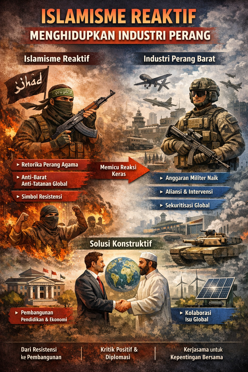 Jika tujuan akhirnya adalah martabat dan kemandirian umat, maka strategi proaktif lebih menjanjikan daripada reaksi emosional. Tanpa refleksi dan koreksi arah, Islamisme reaktif berisiko bukan hanya gagal mencapai cita-citanya. Tetapi juga tanpa sadar menghidupkan industri perang yang justru mempersempit ruang gerak dunia Islam sendiri.
