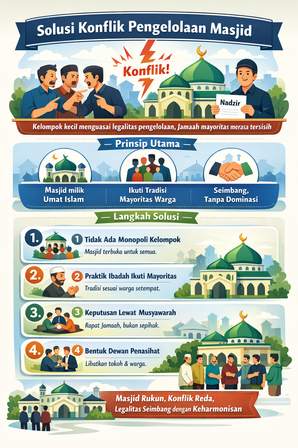 Konflik pengelolaan masjid pada akhirnya bukan soal siapa yang benar secara hukum. Tetapi siapa yang mampu menjaga keutuhan umat.