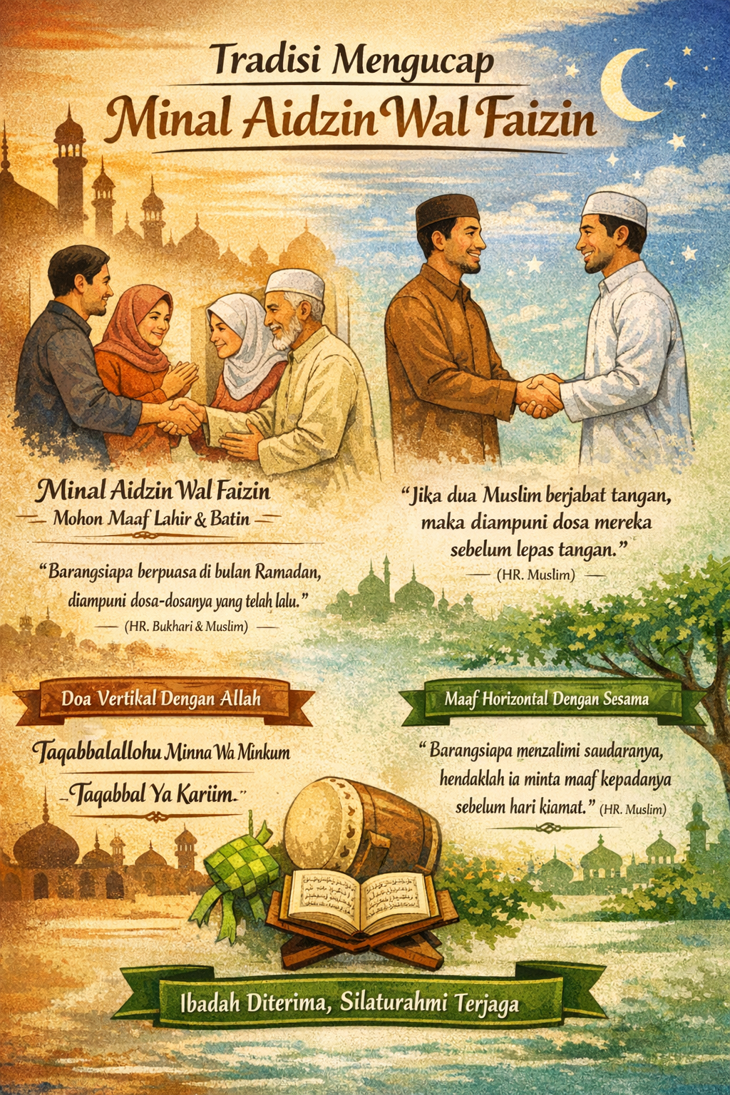 Dengan demikian, rangkaian ucapan Minal aidzin wal faizin, mohon maaf lahir dan batin, dan balasan Taqabbalallohu minna wa minkum, taqabbal ya Karim bukan sekadar budaya. Tetapi memiliki justifikasi teologis yang kuat.