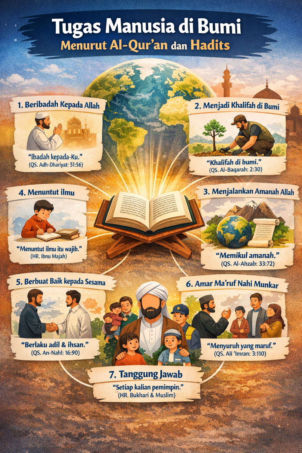Dengan demikian, Al-Qur’an dan hadis memberikan gambaran utuh tentang misi manusia di dunia. Ialah beribadah kepada Allah, mengelola bumi, memikul amanah, menuntut ilmu, berbuat baik kepada sesama, menegakkan kebaikan, serta mempertanggungjawabkan setiap perbuatannya.