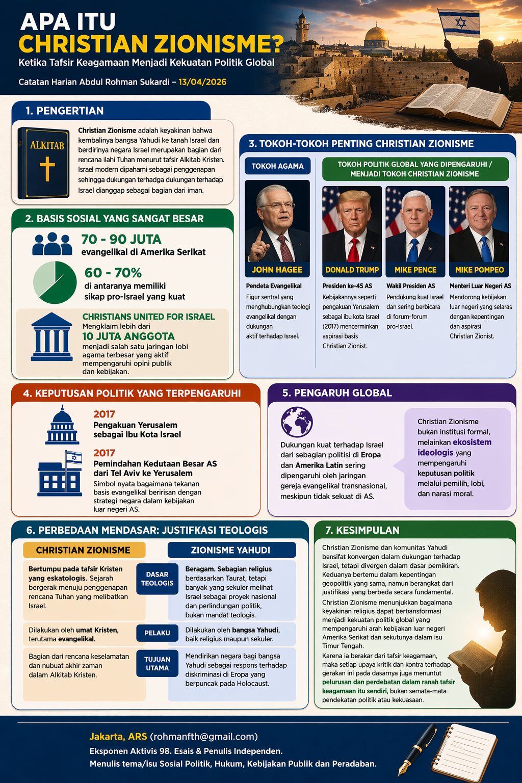 Dalam konteks ini, Christian Zionisme berfungsi bukan sebagai institusi formal. Melainkan sebagai ekosistem ideologis yang memengaruhi keputusan politik melalui pemilih, lobi, dan narasi moral.