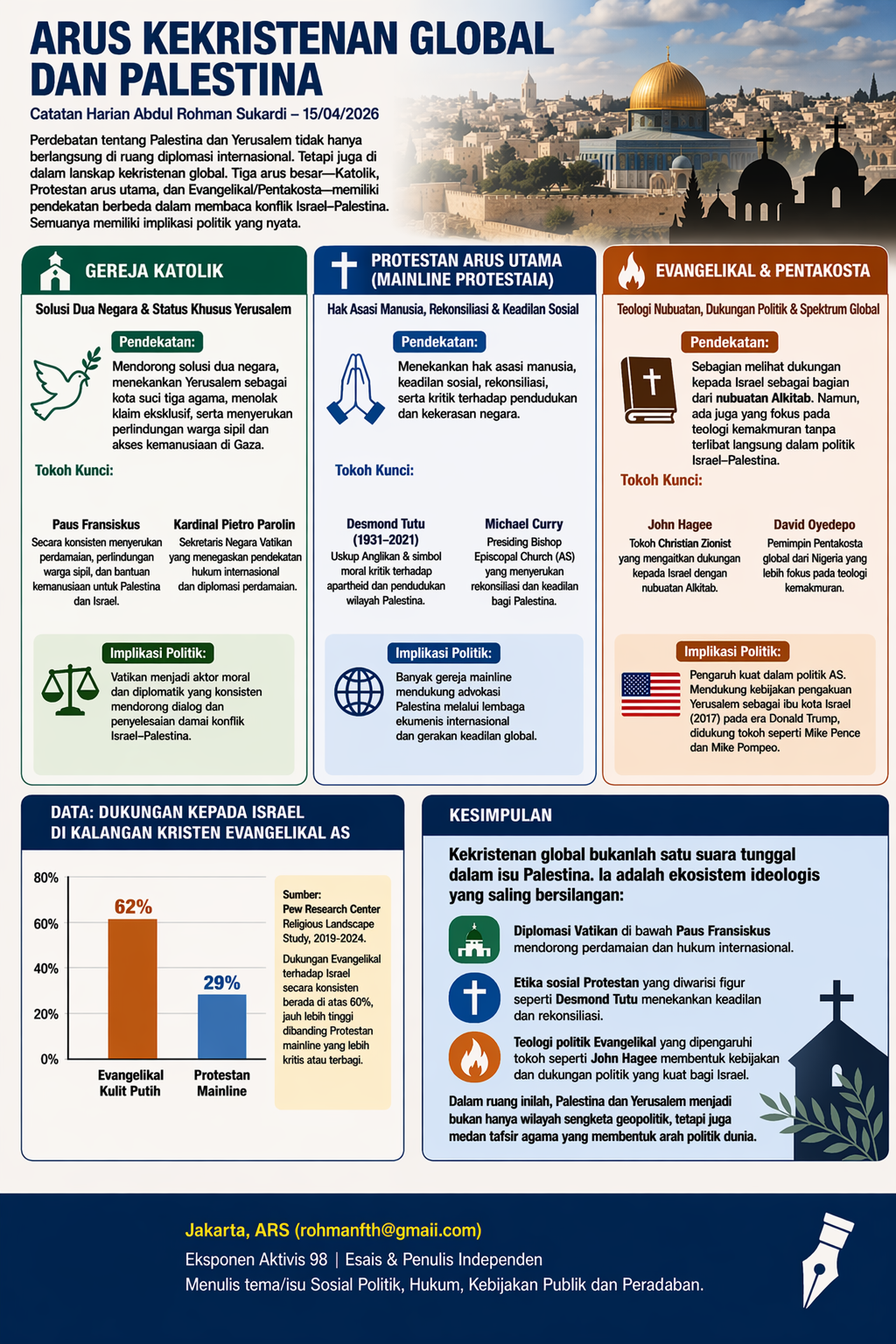 Pada akhirnya, kekristenan global tidak dapat dipahami sebagai satu suara tunggal dalam isu Palestina. Ia adalah ekosistem ideologis yang saling bersilangan. Diplomasi Vatikan di bawah Paus Fransiskus, etika sosial Protestan yang diwarisi figur seperti Desmond Tutu, dan teologi politik Evangelikal yang dipengaruhi tokoh seperti John Hagee.
