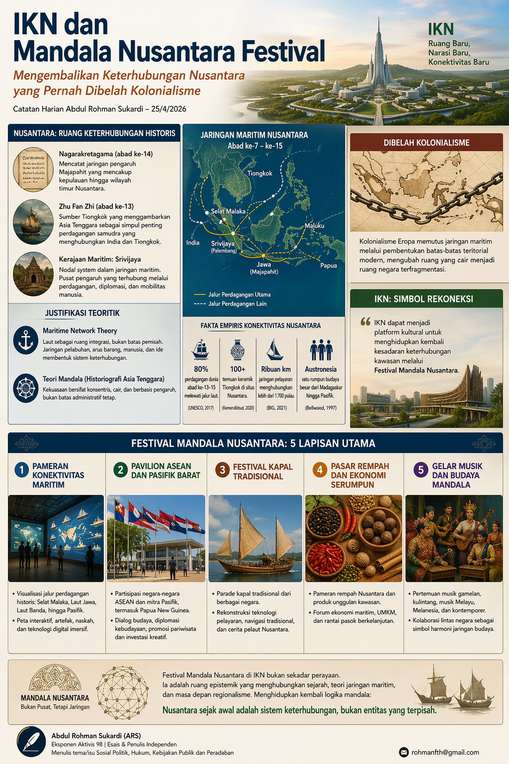 IKN tidak diposisikan sebagai pusat dominasi baru. Melainkan sebagai medium naratif untuk menghidupkan kembali logika mandala. Bahwa Nusantara sejak awal adalah sistem keterhubungan, bukan entitas yang terpisah.