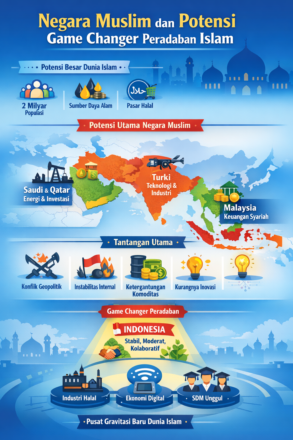 Jika mampu mengelola potensinya secara optimal—terutama dalam pengembangan industri halal, ekonomi digital, dan penguatan sumber daya manusia—Indonesia berpeluang menjadi pusat gravitasi baru dunia Muslim.