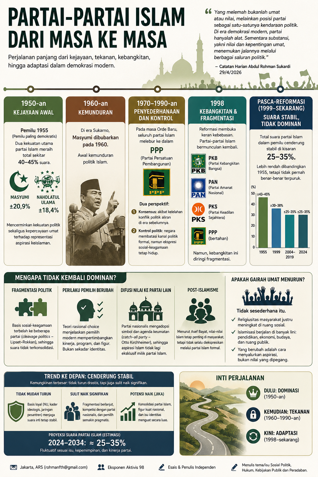 Perjalanan partai-partai Islam di Indonesia menunjukkan transformasi dari dominasi menuju adaptasi. Yang melemah bukanlah umat atau nilai, melainkan posisi partai sebagai satu-satunya kendaraan politik.