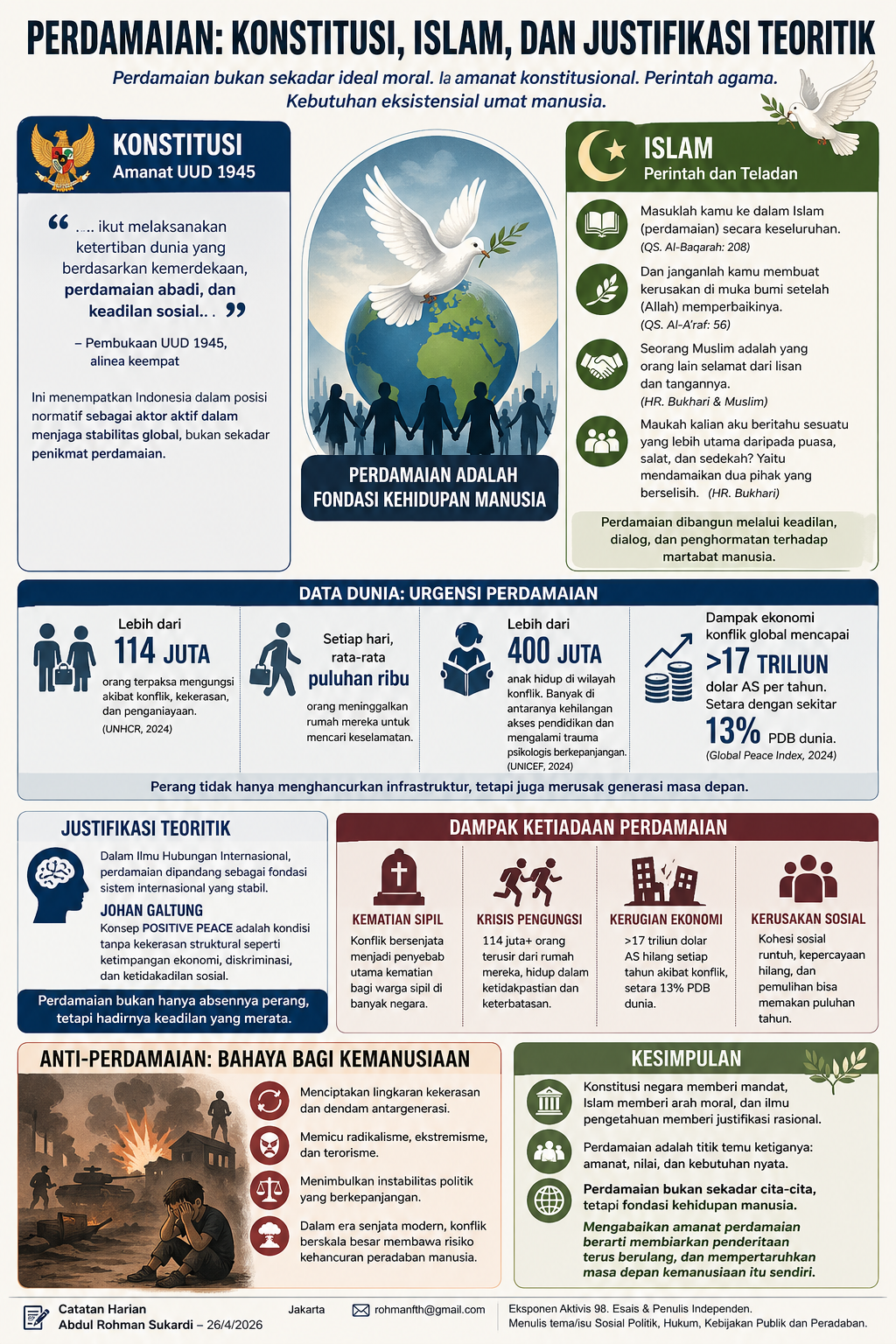 Dengan demikian, perdamaian memiliki legitimasi yang saling menguatkan. Konstitusi negara, ajaran agama, dan rasionalitas ilmiah. Ia bukan sekadar cita-cita, tetapi fondasi kehidupan manusia.