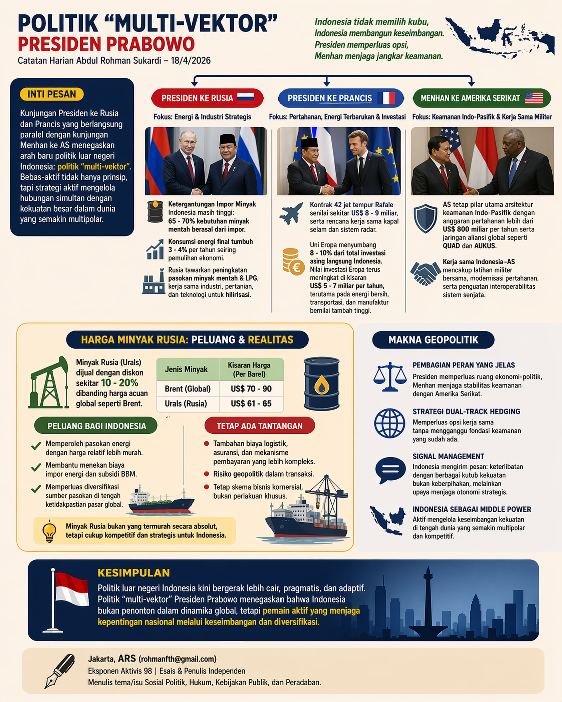 Pergerakan Presiden-Menhan itu menegaskan arah baru politik luar negeri Indonesia yang semakin terstruktur sebagai politik “multi-vektor”. Pendekatan ini memperluas prinsip bebas-aktif. Menjadi strategi aktif dalam mengelola hubungan simultan dengan kekuatan besar yang saling bersaing dalam tatanan global multipolar.