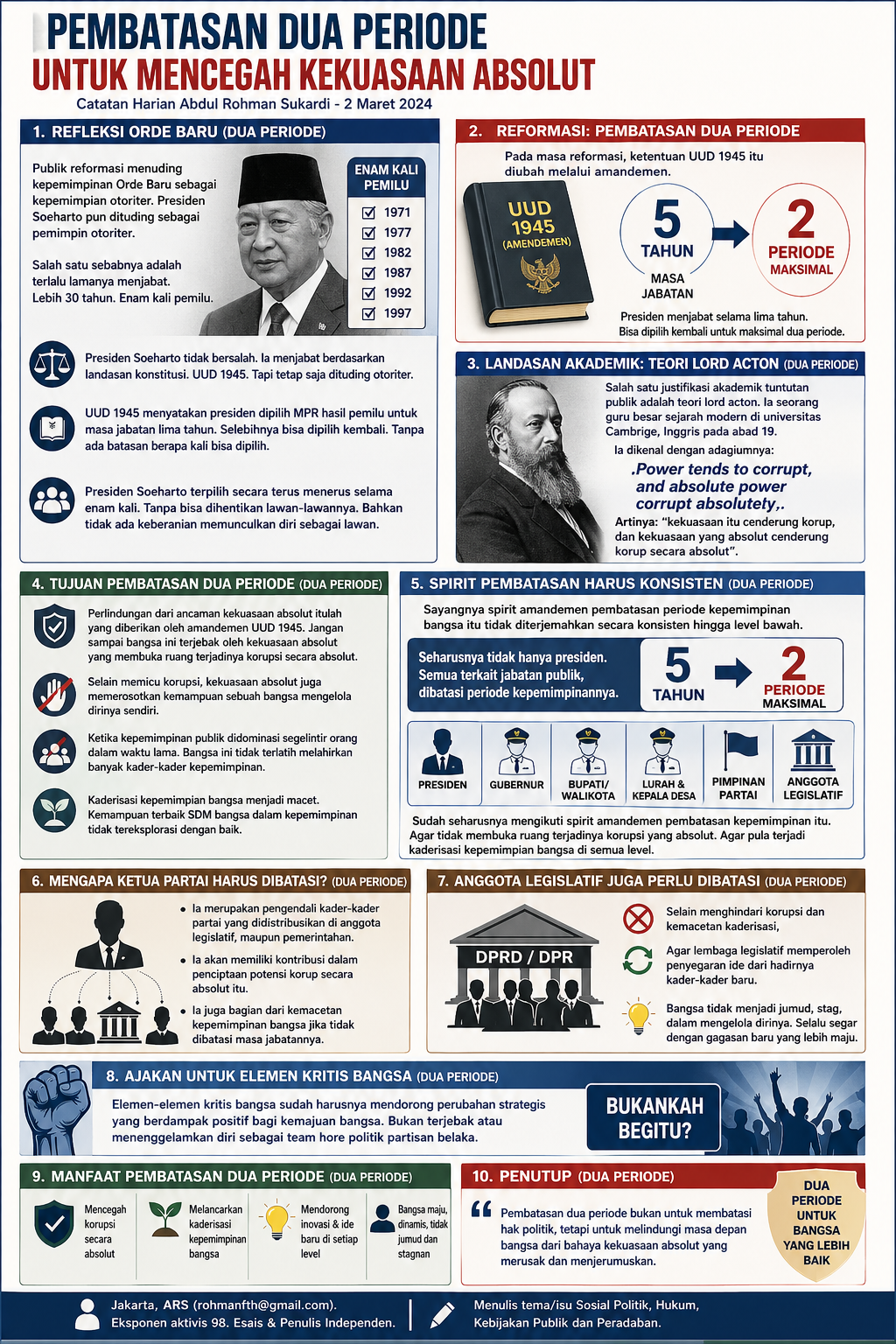 Presiden, gubernur, bupati/walikota, lurah, kepala desa, pimpinan partai, hingga anggota legislatif sudah semestinya mengikuti semangat ini. Tujuannya jelas: mencegah korupsi absolut sekaligus mendorong kaderisasi kepemimpinan di semua level.