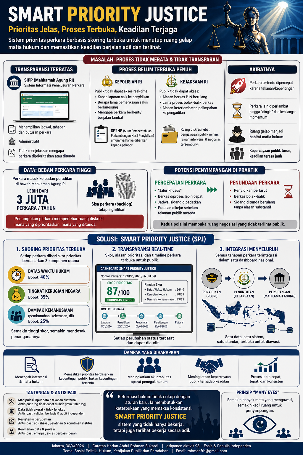 Reformasi hukum tidak cukup dengan aturan baru. Ia membutuhkan keterbukaan yang memaksa konsistensi. Smart Priority Justice menawarkan itu. Sistem yang tidak hanya bekerja, tetapi juga terlihat bekerja secara adil.