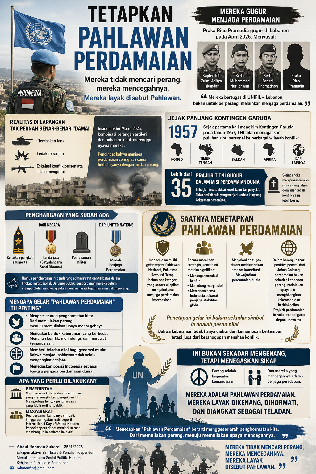 Menetapkan “Pahlawan Perdamaian” berarti menggeser arah penghormatan kita. Dari memuliakan perang, menuju memuliakan upaya mencegahnya.
